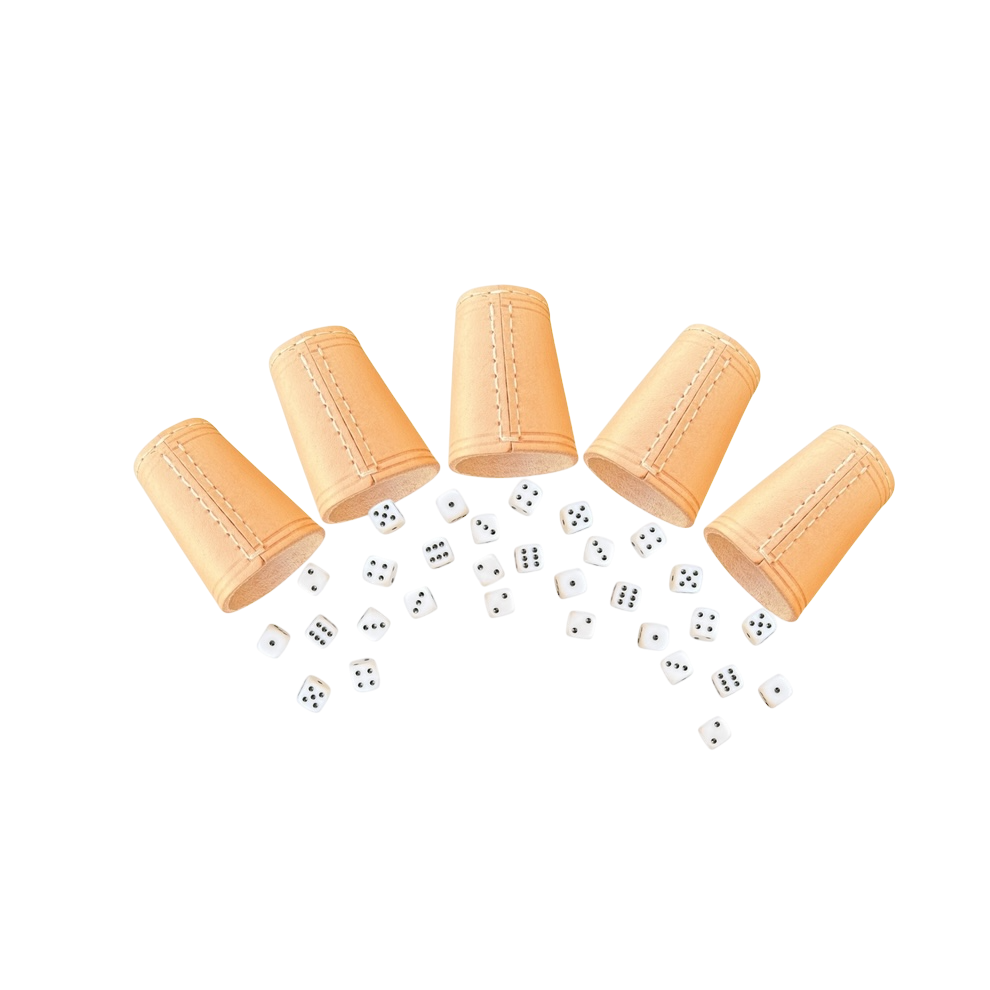 Komplettes Würfelspiel-Set: 5 Naturleder-Becher (9cm) + 30 Würfel (16mm). Traditionelle Handarbeit, langlebig & stilvoll.