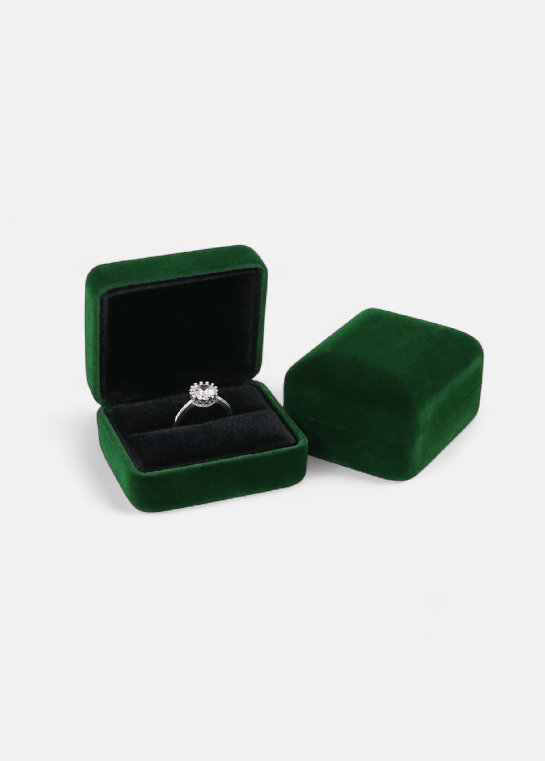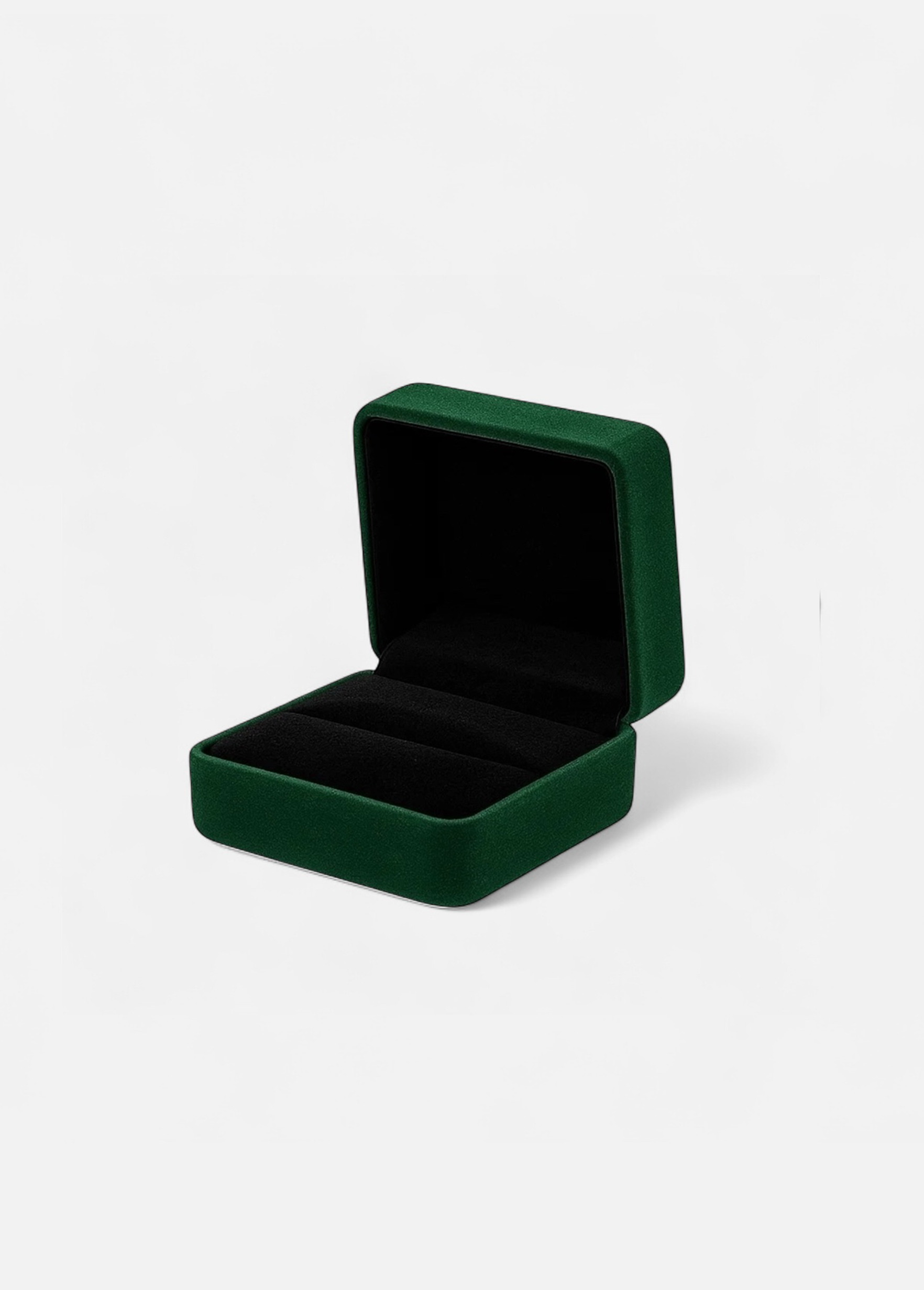 Präsentieren Sie Ihre wertvollsten Schmuckstücke stilvoll – mit dieser edlen Schmuckschatulle aus hochwertigem grünem Samt. Das Ringetui überzeugt durch sein elegantes Design mit schwarzem Samt-Innenfutter und bietet den perfekten Rahmen für Ringe, Verlobungsringe oder kleine Schmuckstücke.